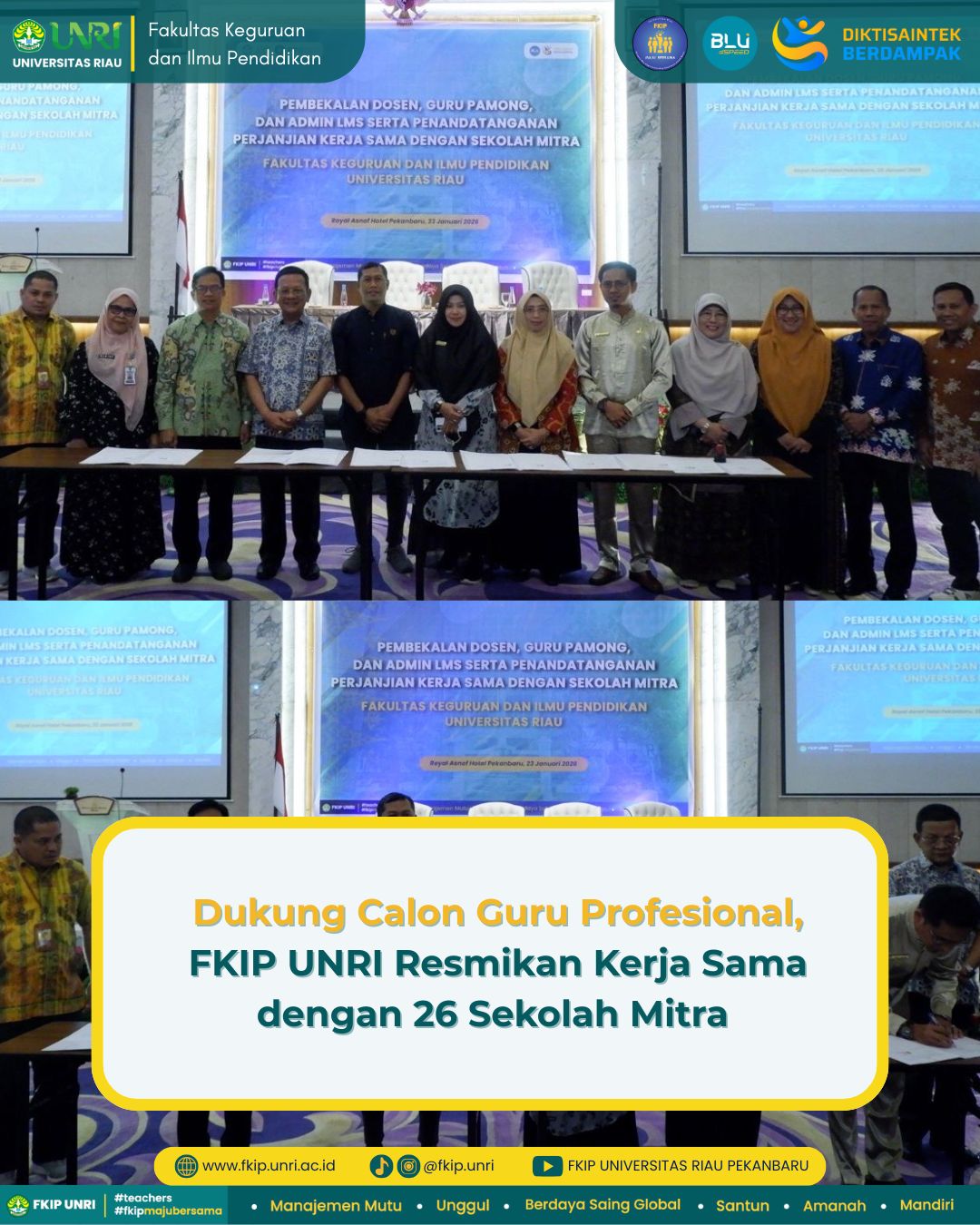 HUMASFKIPINFO – Pekanbaru, January 23, 2026 — The Faculty of Teacher Training and Education (FKIP) Universitas Riau, through the Teacher Professional Education Program (PPG), officially established cooperation agreements with 26 partner schools in Pekanbaru City, covering the elementary (SD), junior high (SMP), and senior high school (SMA) levels.