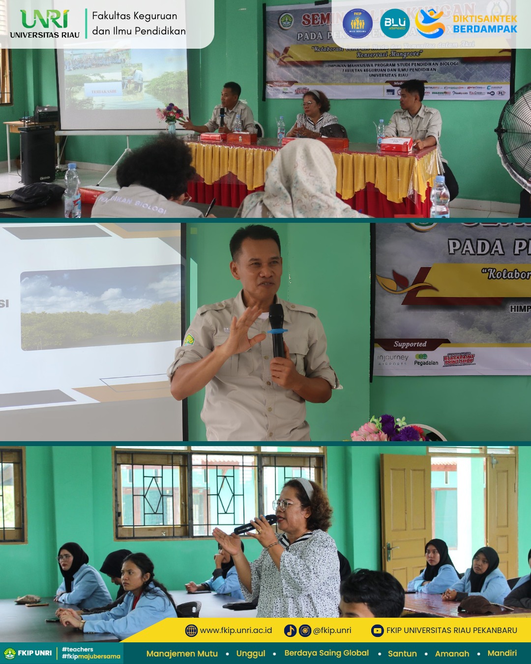 The seminar featured speakers from both academia and practitioners, namely lecturers of the Biology Education Study Program at FKIP UNRI and representatives from the Bengkalis Regency Environmental Agency. Their combined perspectives provided participants with a comprehensive understanding of mangrove conservation issues, covering both scientific viewpoints and policy implementation in the field. This approach offered participants broader and more applicable insights into the importance of collaboration in safeguarding coastal ecosystems.