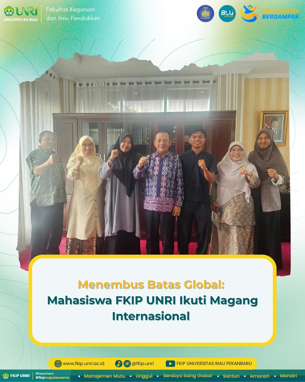 Melalui program ini, mahasiswa diharapkan mampu mengembangkan potensi diri, meningkatkan kompetensi profesional di lingkungan internasional, serta membangun jejaring global yang dapat menjadi bekal penting dalam menghadapi tantangan dunia kerja di masa depan. FKIP Universitas Riau terus berkomitmen mendorong mahasiswa untuk berpartisipasi aktif dalam program internasional sebagai bagian dari upaya mewujudkan lulusan yang unggul dan berdaya saing global.
