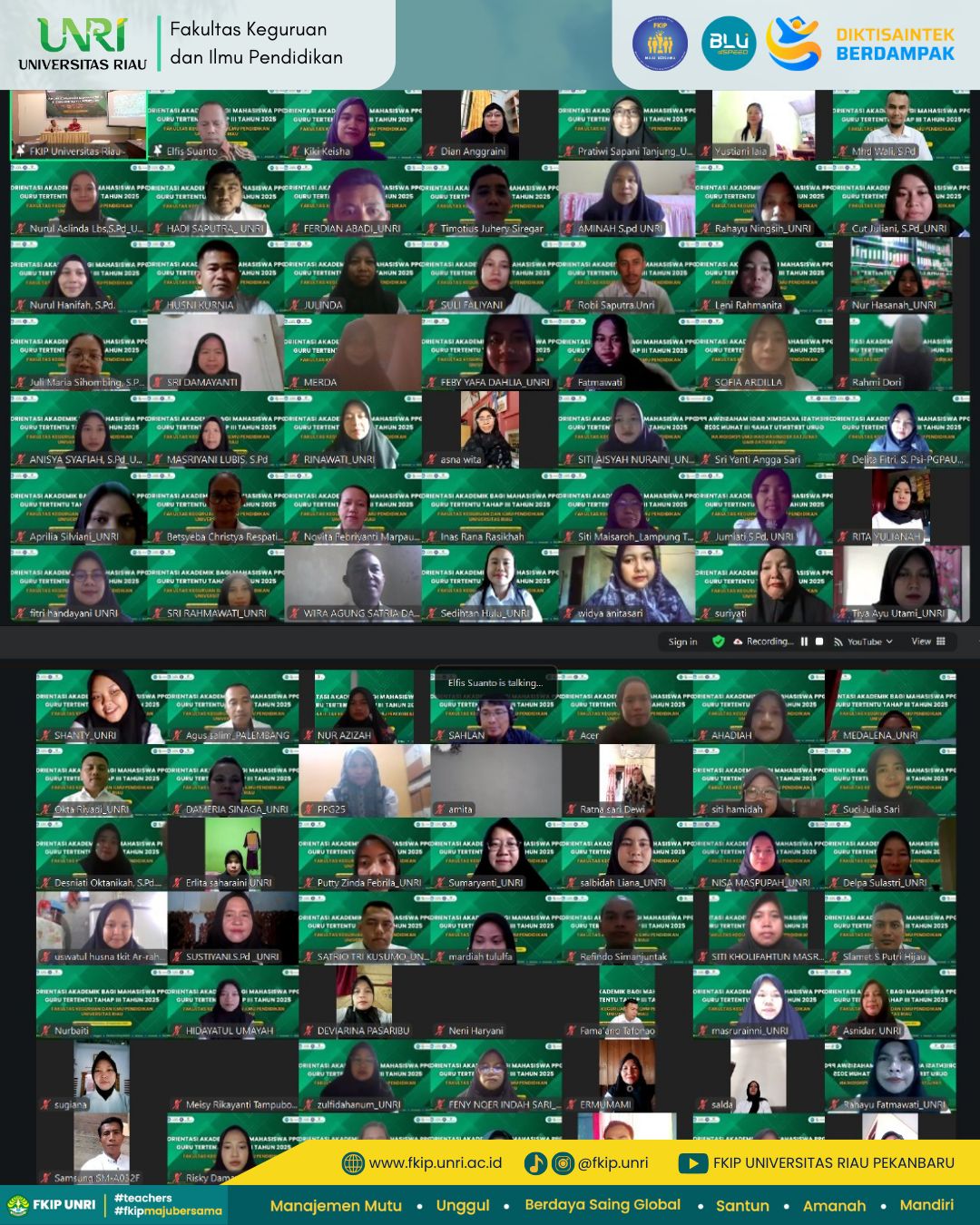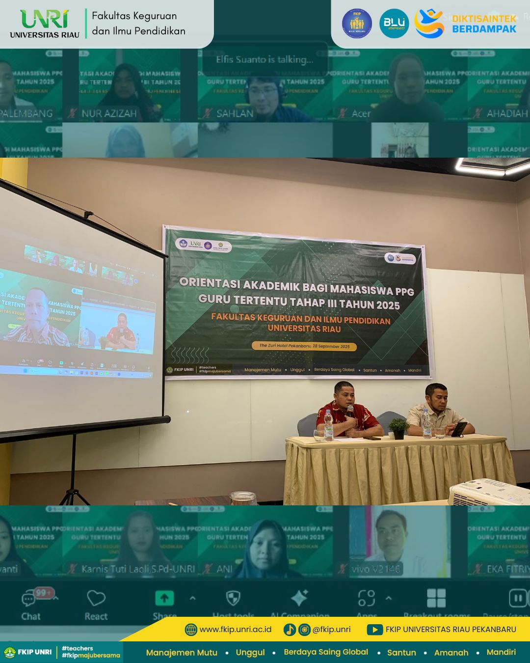 Pekanbaru, September 28, 2025 — The Faculty of Teacher Training and Education, Universitas Riau (FKIP UNRI), officially organized the Academic Orientation for 990 students of the PPG (Teacher Professional Education) Program for Specific Teachers, Phase III of 2025. The event was held online on Sunday, September 28, 2025.