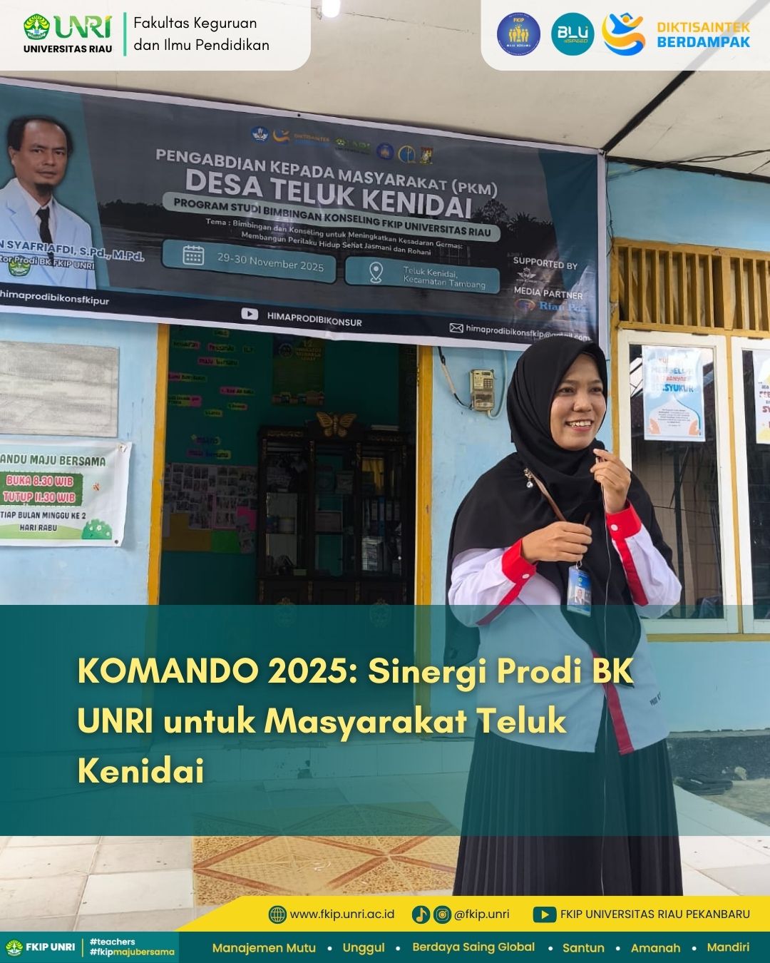 HUMASFKIPINFO – Pekanbaru, November 29, 2025 — The Guidance and Counseling (BK) Study Program of the Faculty of Teacher Training and Education, Universitas Riau, reaffirmed its commitment to the Tri Dharma of Higher Education through the implementation of “Community Counseling and Outbound (KOMANDO) 2025.” The two-day program, held on November 29–30, 2025, featured a series of comprehensive community service activities for residents of Teluk Kenidai.