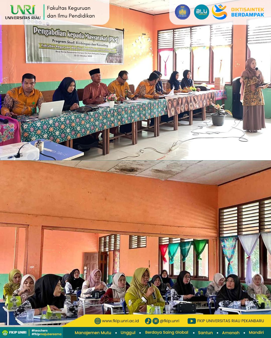 HUMASFKIPINFO – Pekanbaru, October 23, 2025 — The Guidance and Counseling (BK) Study Program of the Faculty of Teacher Training and Education (FKIP), Universitas Riau, conducted a Community Service Program titled Art Therapy Workshop for elementary and junior high school teachers in Kampar Kiri Hulu. Held over two days, on October 22–23, 2025, at SMP Negeri 1 Kampar Kiri Hulu, the activity aimed to enhance teachers’ competence in providing creative, responsive, and effective counseling services.