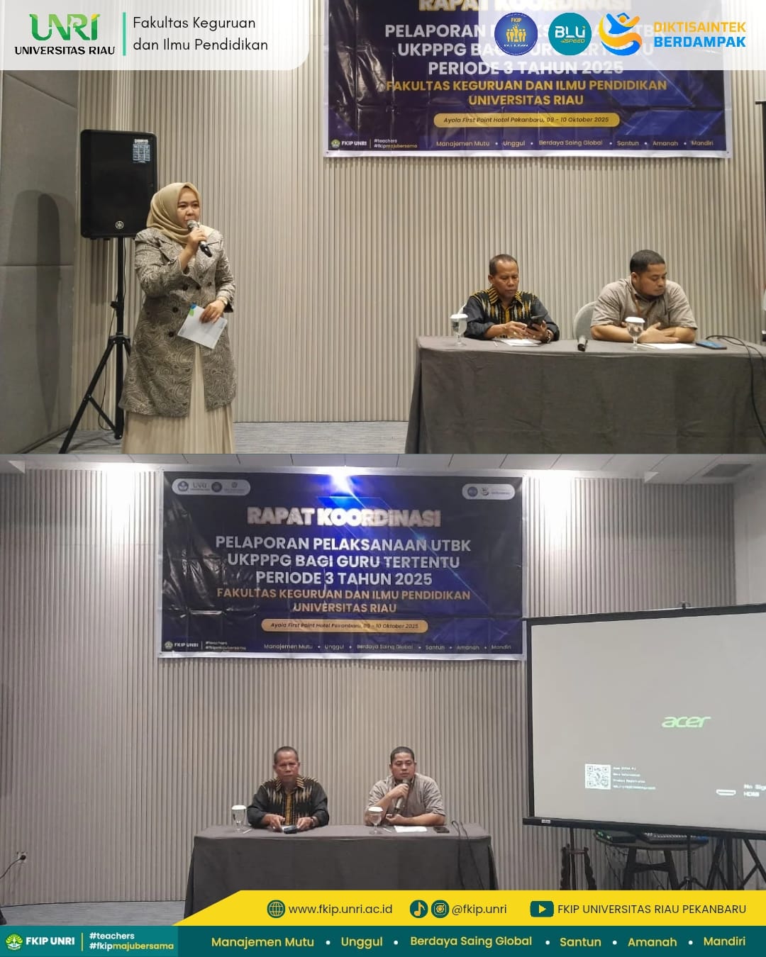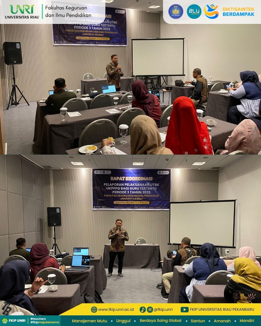 HUMASFKIPUNRI INFO – Pekanbaru, October 9, 2025 — The Faculty of Teacher Training and Education, Universitas Riau (FKIP UNRI), held a Coordination Meeting on Reporting for the Implementation of the Computer-Based Written Examination (UTBK) of the Teacher Professional Competency Test (UKPPPG) for Specific Teachers, Period 3 of 2025. The meeting took place at Ayola First Point Hotel, Pekanbaru, and served as part of FKIP UNRI’s continuous effort to ensure the smooth, accurate, and accountable execution of the UKPPPG—an essential stage in the certification process for professional teachers.