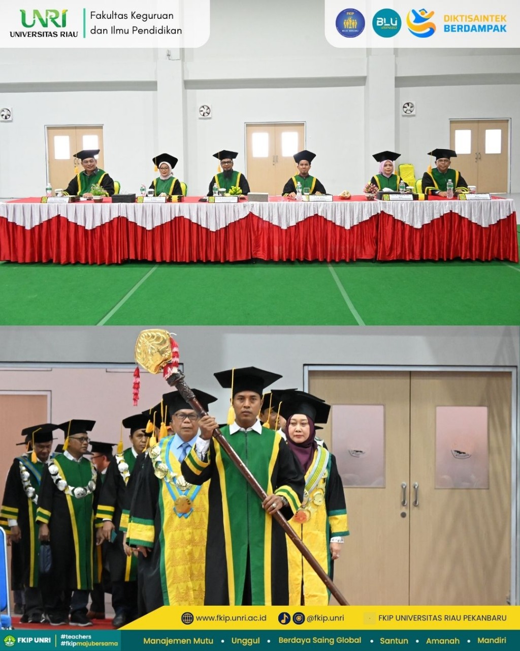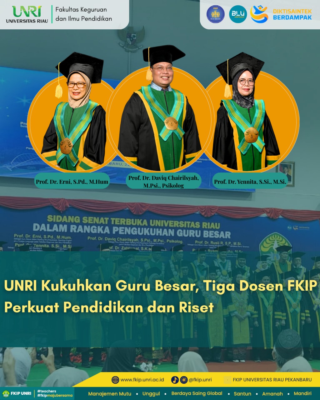 HUMASFKIPUNRI INFO - Pekanbaru, September 22, 2025 — Universitas Riau (UNRI) officially inaugurated three lecturers from the Faculty of Teacher Training and Education (FKIP) as Professors, recognizing their dedication and contributions to education and research. Those inaugurated were: