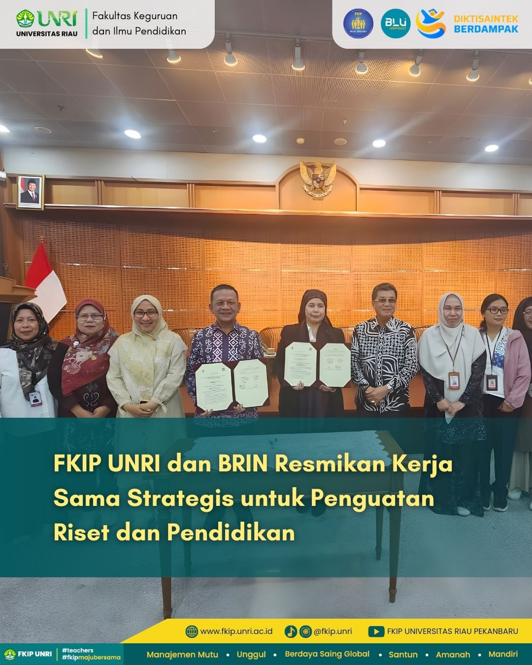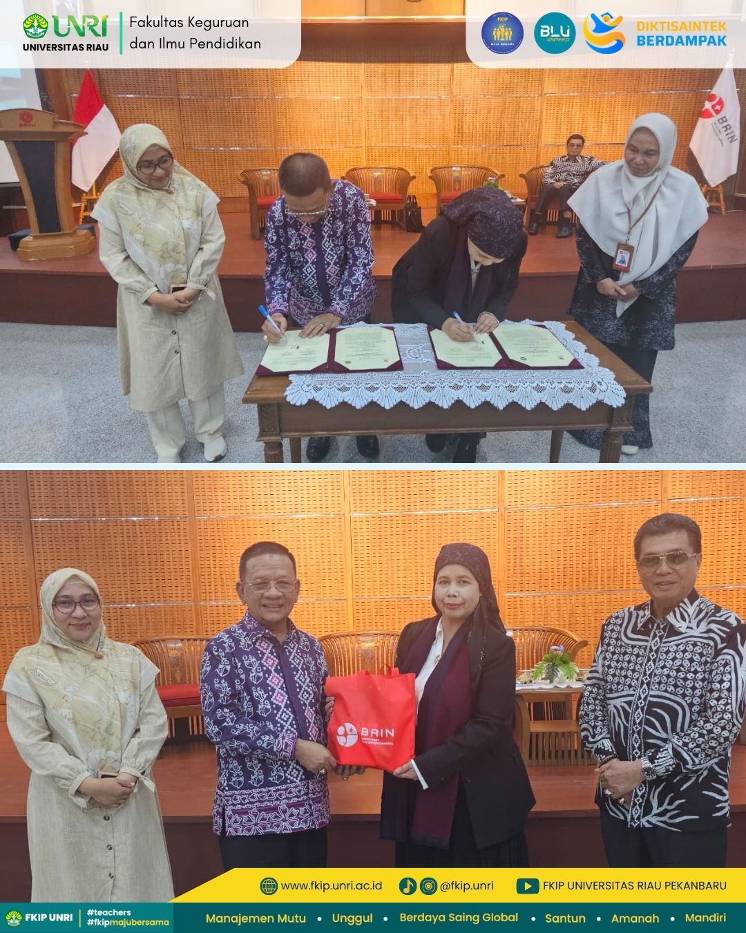 HUMASFKIPINFO – Pekanbaru, 3 Desember 2025 — FKIP Universitas Riau bersama Badan Riset dan Inovasi Nasional (BRIN) melaksanakan penandatanganan perjanjian kerja sama di Auditorium BRIN Jakarta Selatan pada Rabu, 3 Desember 2025. Kegiatan ini dihadiri oleh Dekan FKIP UNRI, Prof. Dr. Jimmi Copriady, M.Si, didampingi Guru Besar Prodi Pendidikan Bahasa dan Sastra Indonesia, Prof. M. Nur Mustafa, M.Pd, Wakil Dekan Bidang Kemahasiswaan, Alumni dan Kerja Sama, Dr. Ria Novianti, M.Pd, serta Ketua Jurusan Pendidikan Bahasa dan Seni, Dr. Charlina, M.Hum. Turut hadir Kepala Riset Bahasa, Sastra, dan Komunitas BRIN beserta jajaran serta para periset lintas budaya.