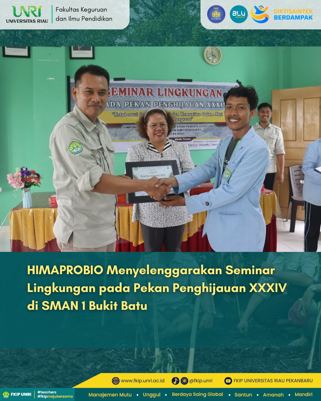 HUMASFKIPUNRI INFO - HIMAPRODI Pendidikan Biologi FKIP Universitas Riau telah melaksanakan Seminar Lingkungan di SMAN 1 Bukit Batu, Kabupaten Bengkalis pada tanggal 30 Agustus 2025. Kegiatan ini mengusung tema “Kolaborasi Generasi Muda dan Komunitas dalam Aksi Konservasi Mangrove”, yang bertujuan untuk meningkatkan pemahaman peserta terhadap pentingnya ekosistem mangrove sebagai penyangga lingkungan pesisir. Seminar ini dihadiri oleh siswa, guru, serta perwakilan komunitas lokal, sehingga menciptakan ruang dialog yang konstruktif mengenai peran aktif berbagai elemen masyarakat dalam menjaga kelestarian lingkungan.
