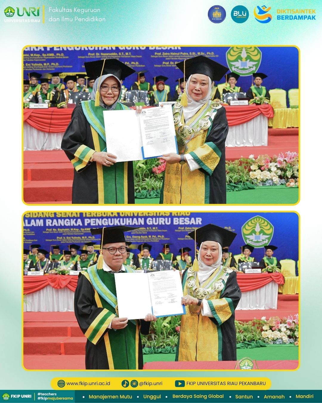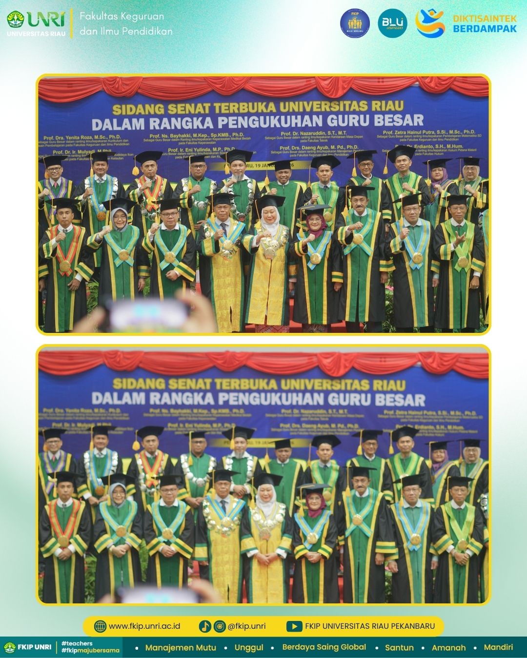 Melalui pengukuhan ini, Universitas Riau terus mendorong terciptanya atmosfer akademik yang produktif dan inovatif, guna mendukung terwujudnya pendidikan berkualitas serta menghasilkan lulusan yang unggul dan berdaya saing.