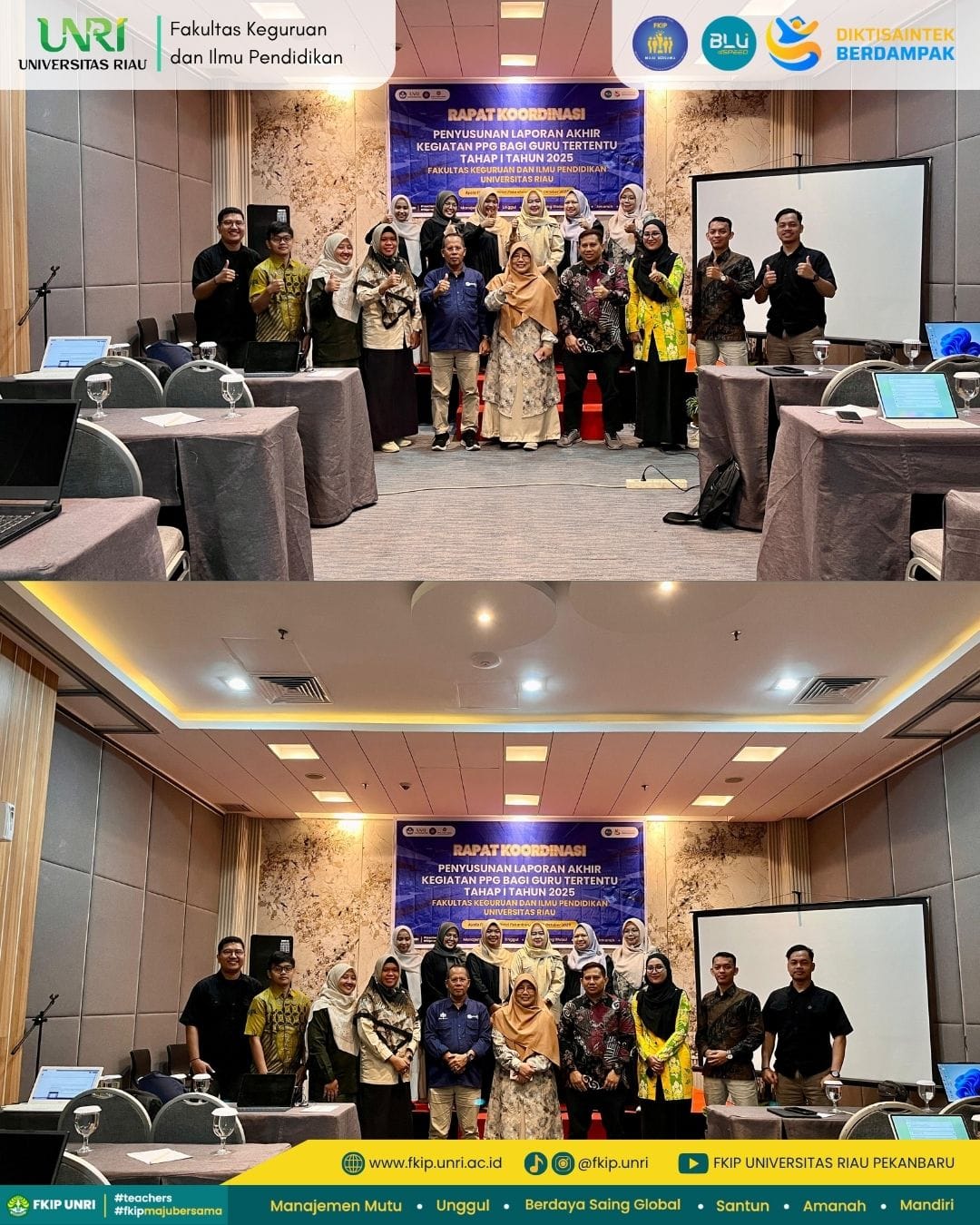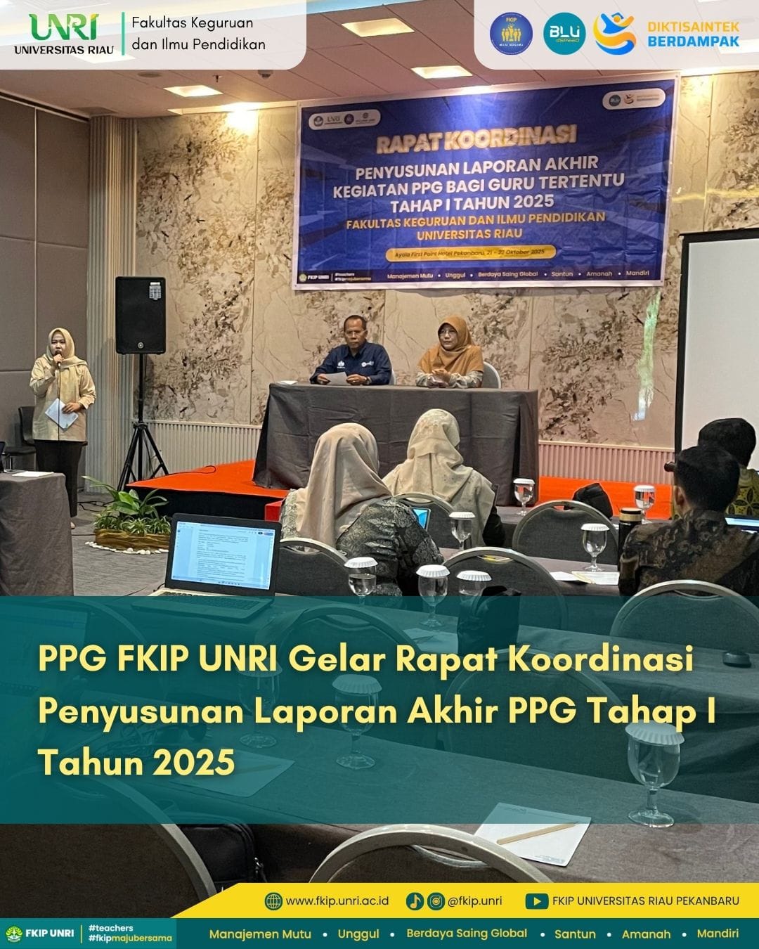 Program Studi Pendidikan Profesi Guru (PPG) Fakultas Keguruan dan Ilmu Pendidikan (FKIP) Universitas Riau menyelenggarakan Rapat Koordinasi Penyusunan Laporan Akhir Kegiatan PPG bagi Guru Tertentu Tahap I Tahun 2025, pada 21–22 Oktober 2025 di Ayola First Point Hotel Pekanbaru.