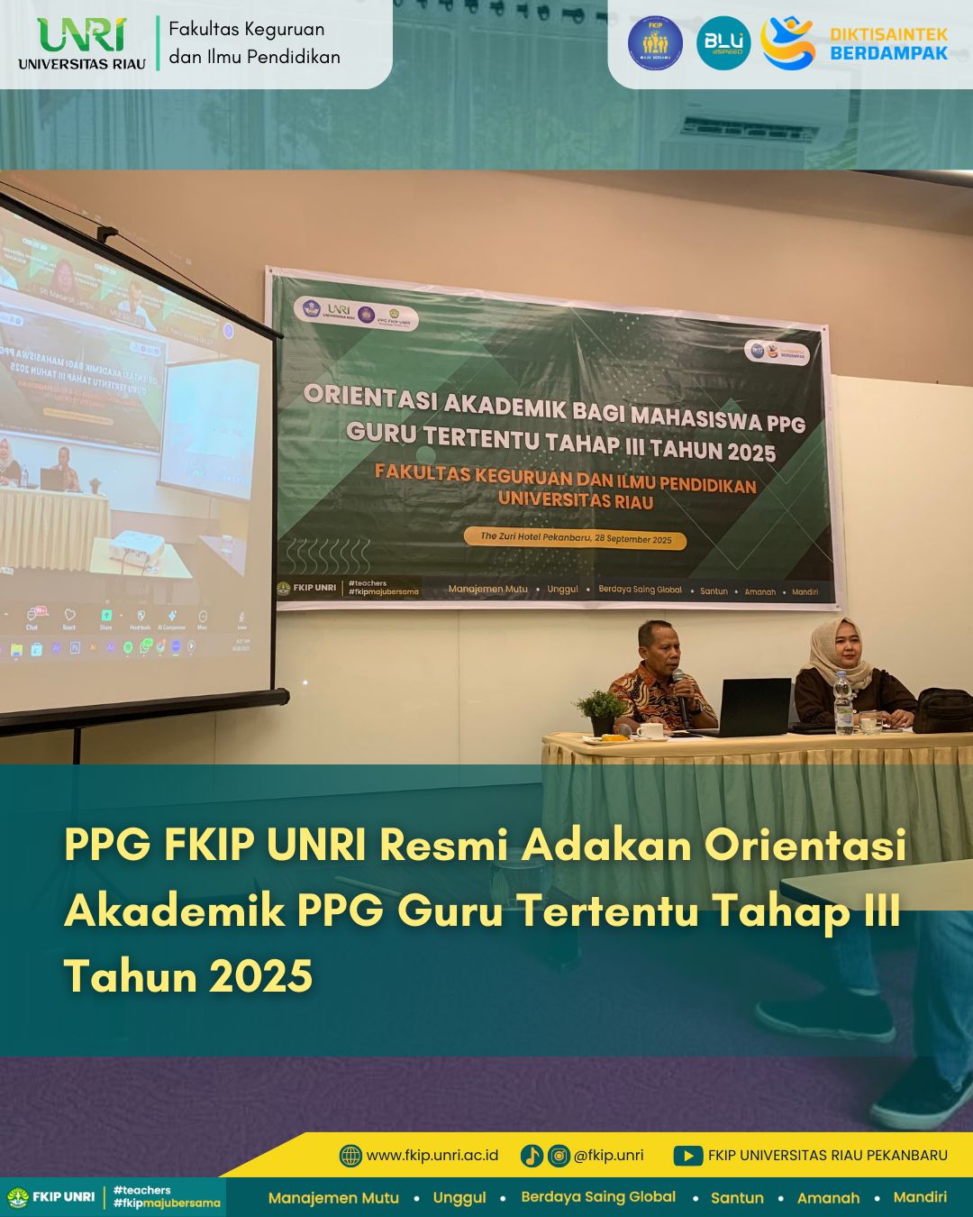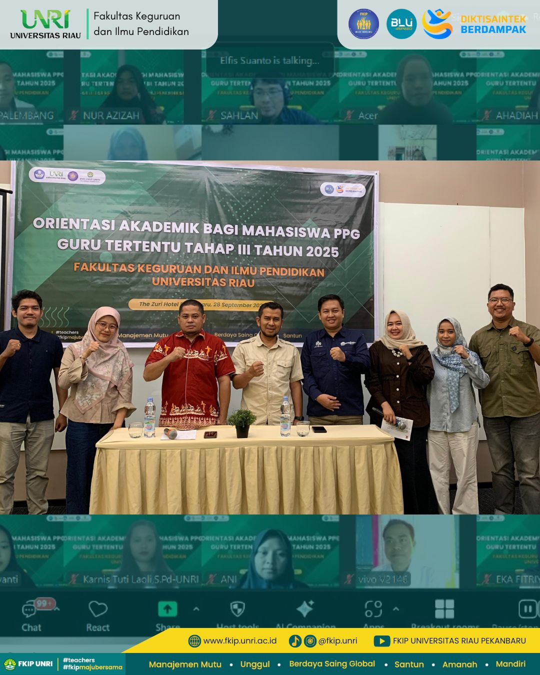 HUMASFKIPUNRI INFO – Fakultas Keguruan dan Ilmu Pendidikan Universitas Riau resmi menyelenggarakan Orientasi Akademik bagi 990 mahasiswa PPG Guru Tertentu yang dilaksanakan secara daring pada Minggu, 28 September 2025.