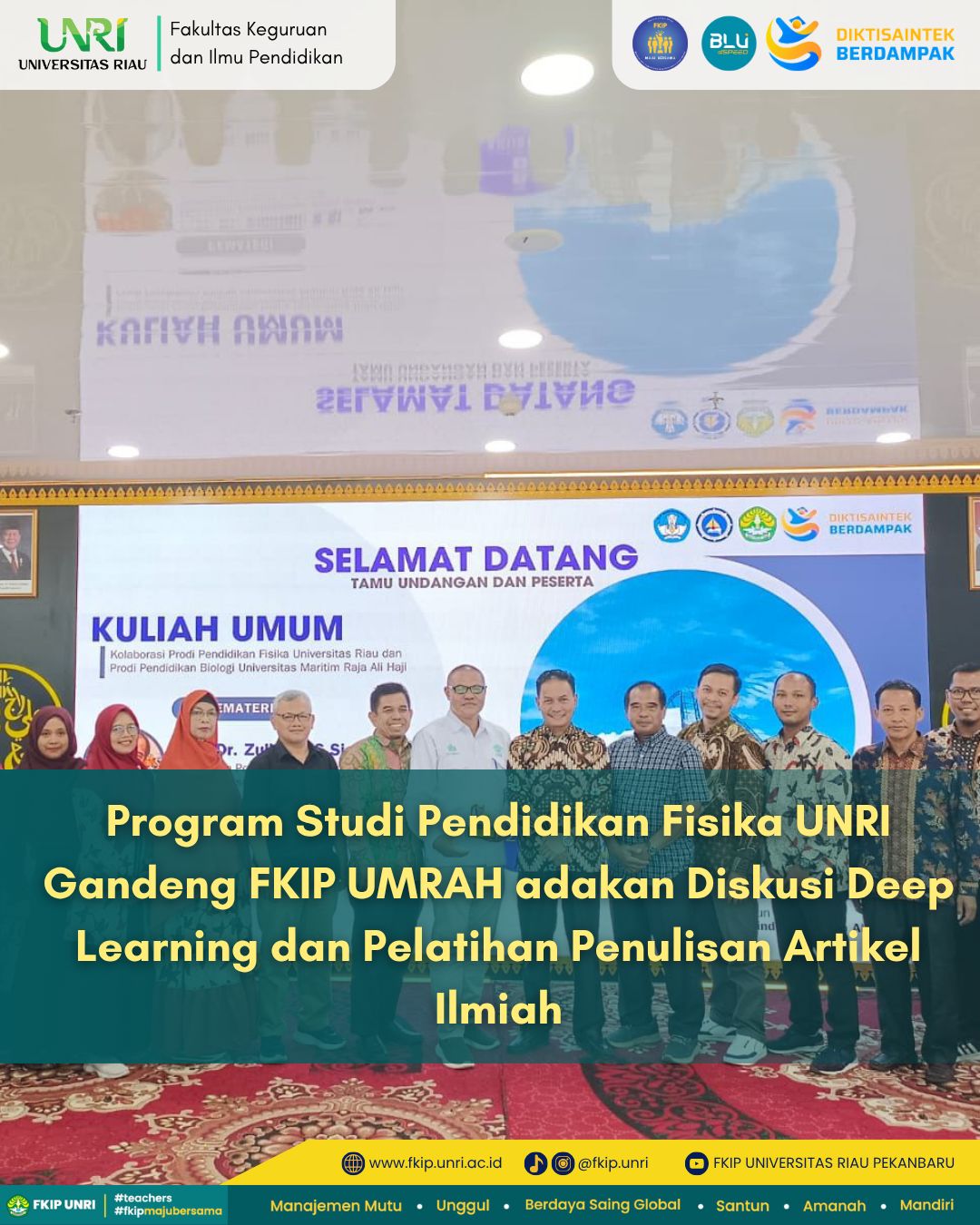 HUMASFKIPUNRI INFO - Pada Rabu 6 Agustus 2025, program studi Pendidikan Fisika FKIP UNRI melakukan kegiatan di Fakultas Keguruan dan Ilmu Pendidikan Universitas Maritim Raja Ali Haji (UMRAH). Terdapat dua agenda utama pada kegiatan ini yaitu pengadaan forum diskusi mengenai implementasi pembelajaran mendalam (deep learning) dan pelatihan penulisan artikel ilmiah internasional bereputasi. Kegiatan ini dihadiri oleh MGMP fisika dan ipa Provinsi Kepulauan Riau serta seluruh civitas akademika di FKIP UMRAH.