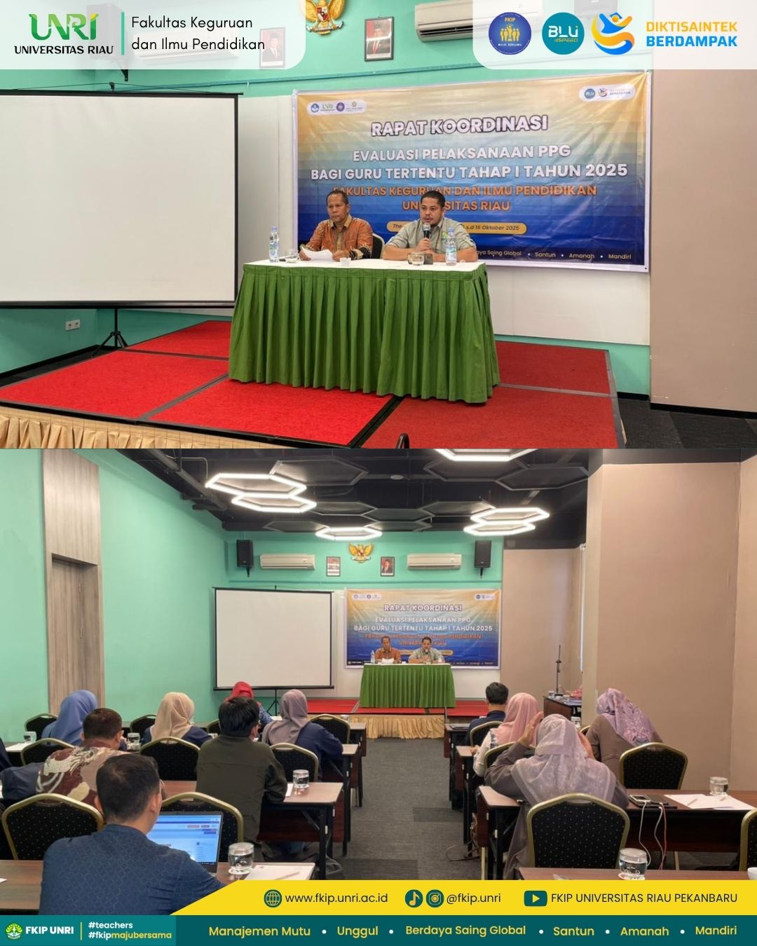 Fakultas Keguruan dan Ilmu Pendidikan (FKIP) Universitas Riau menggelar kegiatan Rapat Koordinasi Evaluasi Pelaksanaan Program Pendidikan Profesi Guru (PPG) Guru Tertentu Tahap 1 Tahun 2025, yang berlangsung selama dua hari, tanggal 15–16 September 2025, bertempat di The Zuri Hotel Pekanbaru.