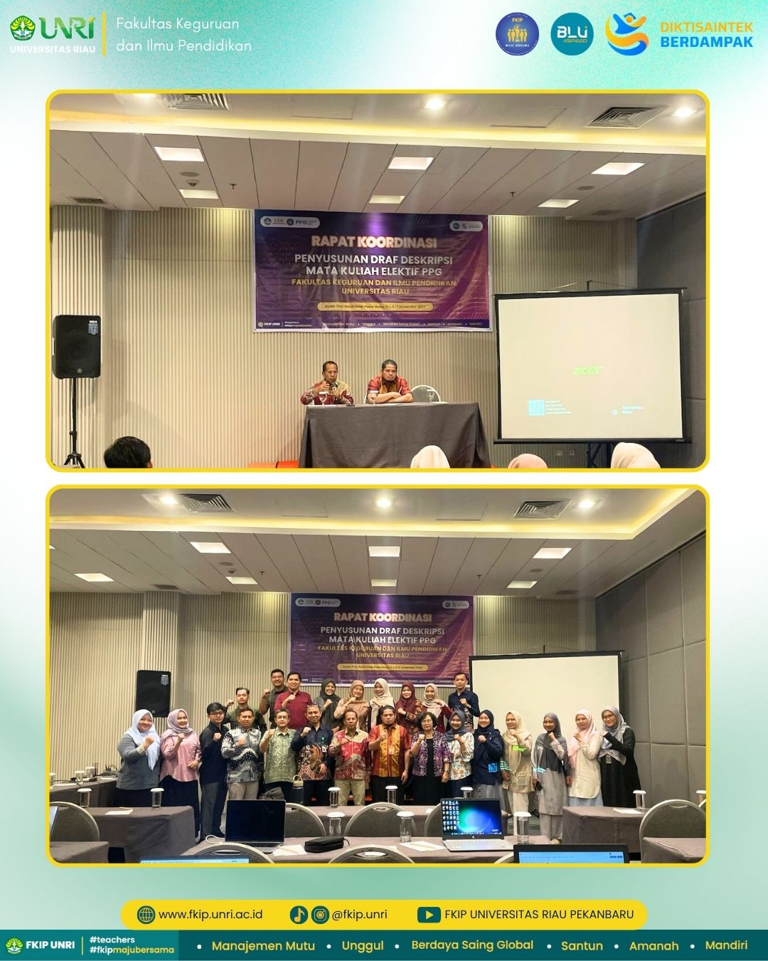 HUMASFKIPINFO – Pekanbaru, 11 Desember 2025 – Fakultas Keguruan dan Ilmu Pendidikan (FKIP) Universitas Riau (UNRI) melaksanakan rapat koordinasi penyusunan draft deskripsi mata kuliah elektif Program Pendidikan Profesi Guru (PPG) pada 11–13 Desember 2025 di Ayola First Point Hotel, Pekanbaru. Kegiatan ini diselenggarakan sebagai bagian dari upaya penguatan dan pengembangan kurikulum PPG FKIP UNRI.