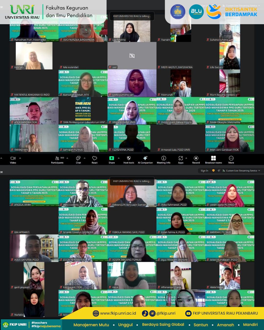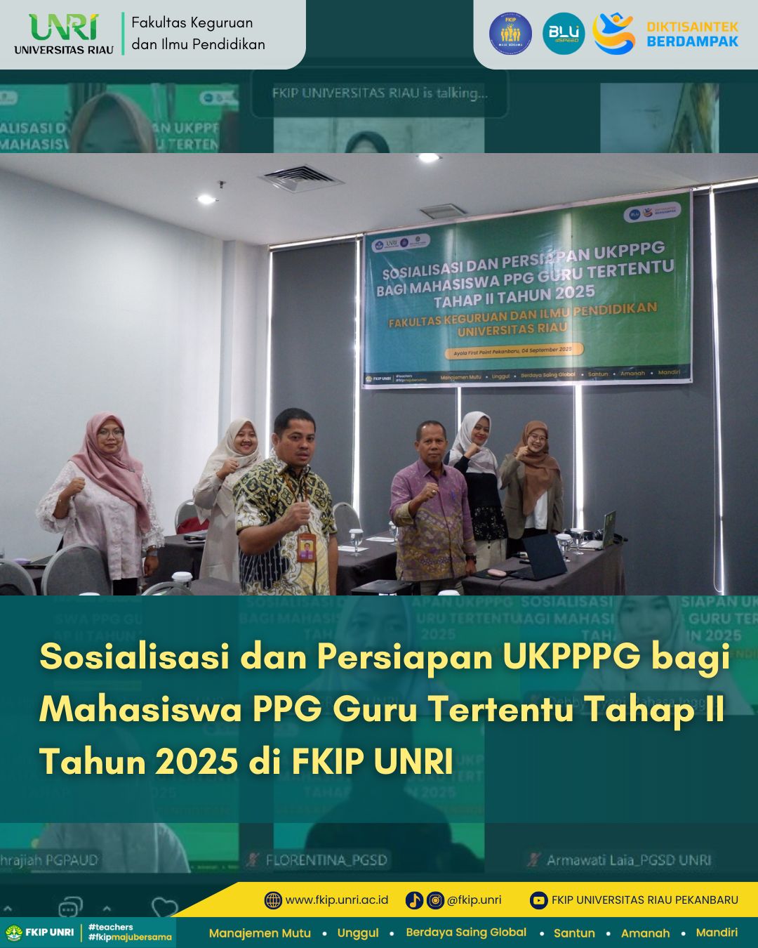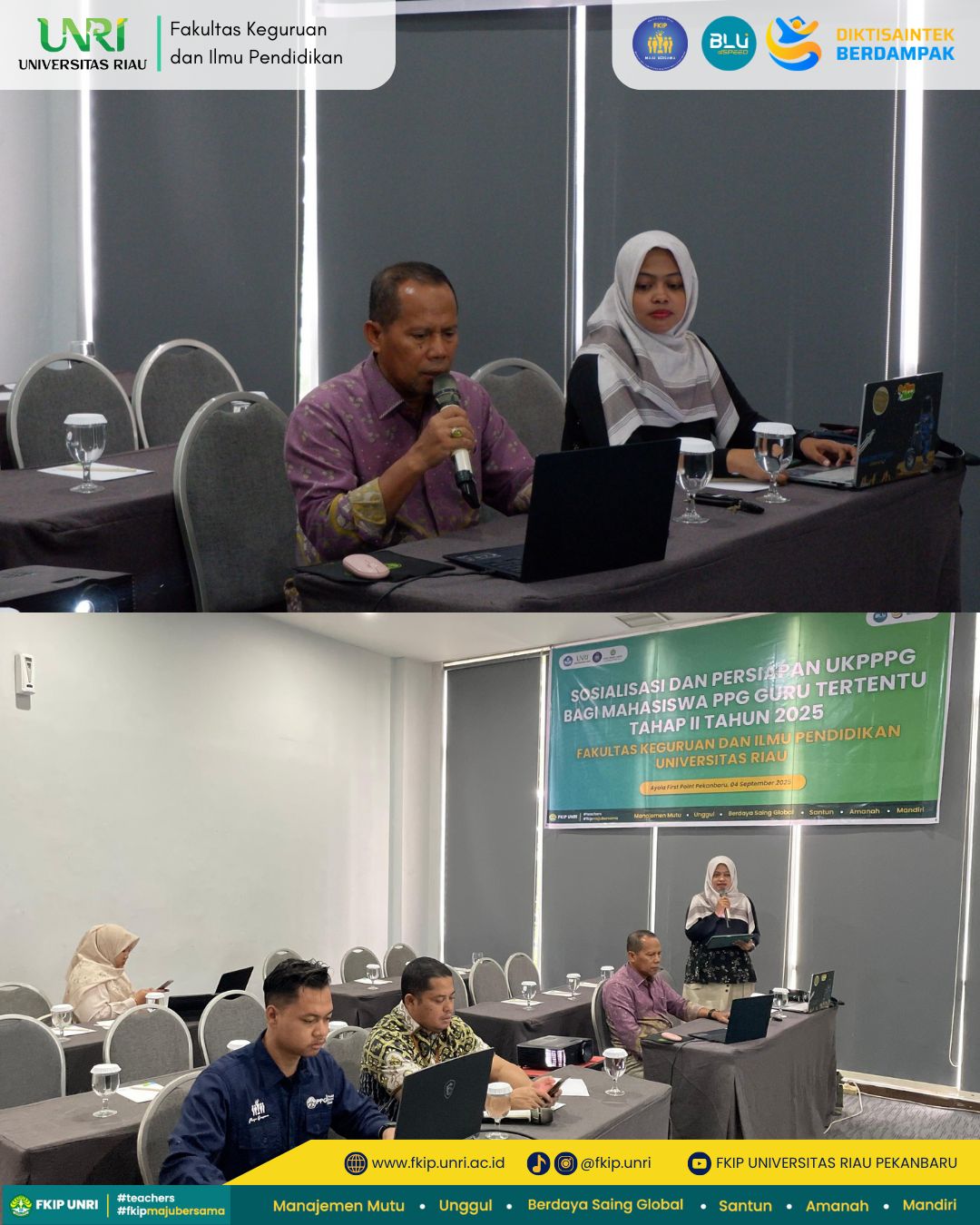 HUMASFKIPUNRI INFO - Program Studi Pendidikan Profesi Guru (PPG) Fakultas Keguruan dan Ilmu Pendidikan (FKIP) Universitas Riau (UNRI) menyelenggarakan kegiatan sosialisasi dan persiapan Uji Kompetensi Profesi Pendidikan dan Pengajaran Guru (UKPPPG) bagi mahasiswa PPG Guru Tertentu Tahap II tahun 2025 pada tanggal 2 September 2025.