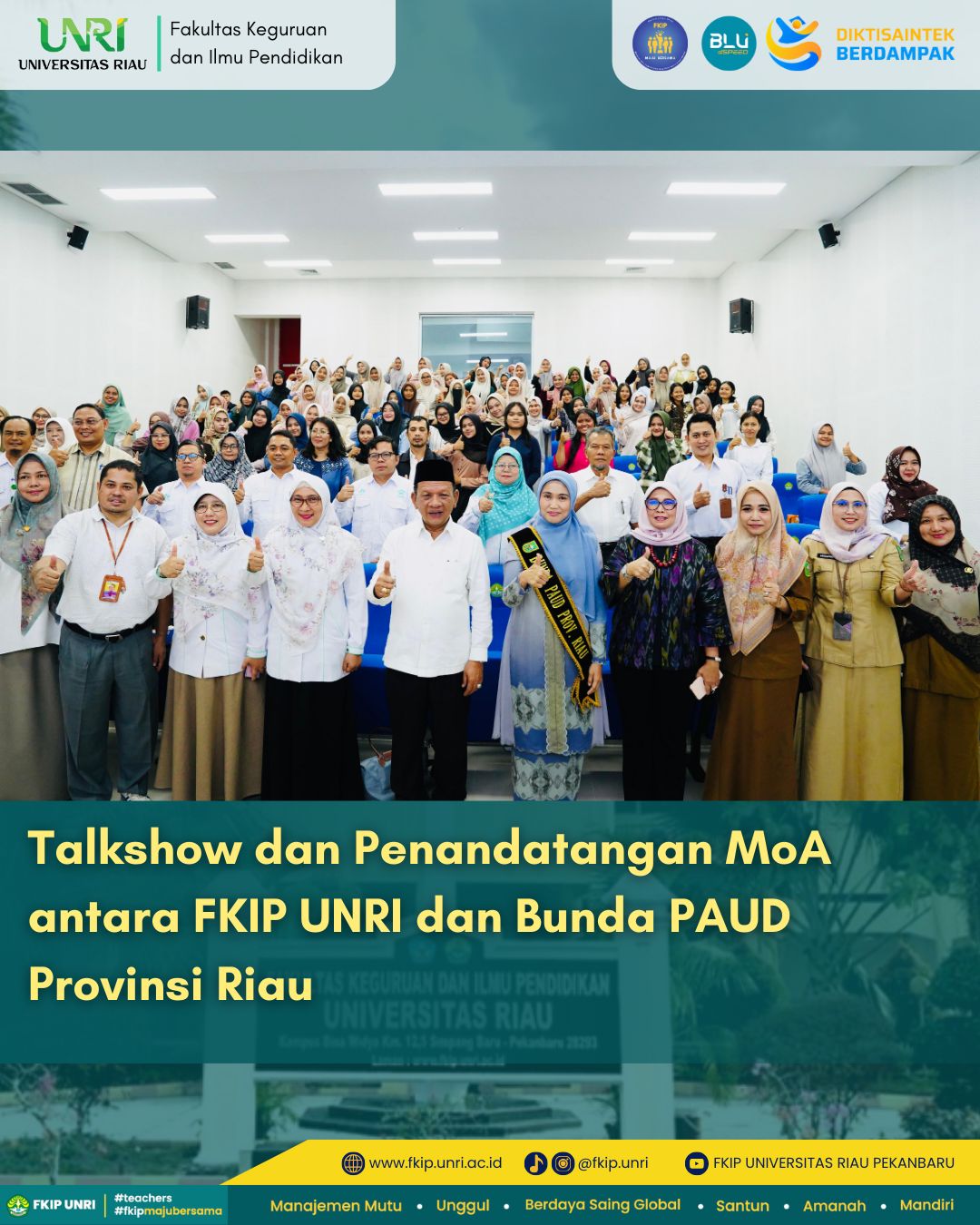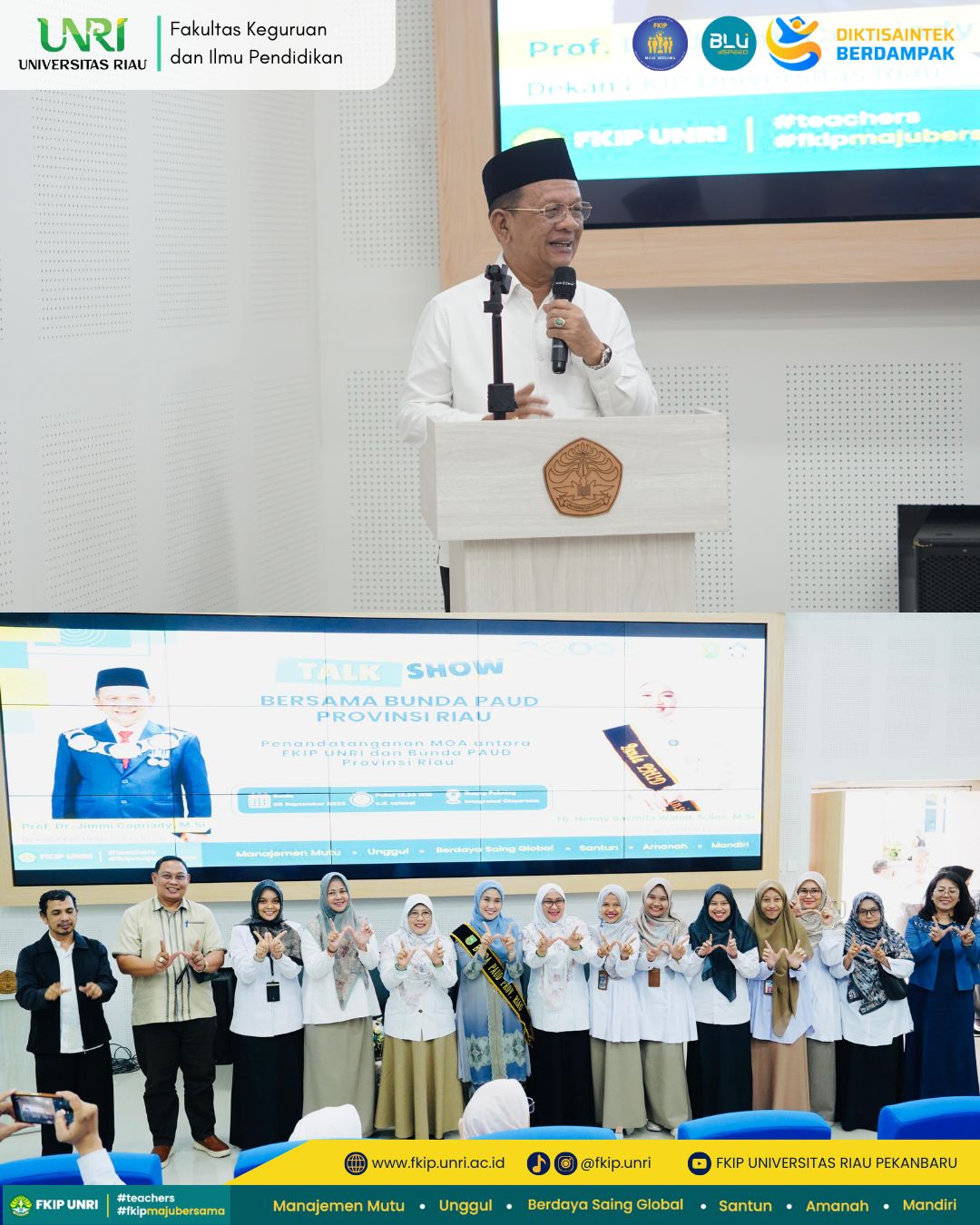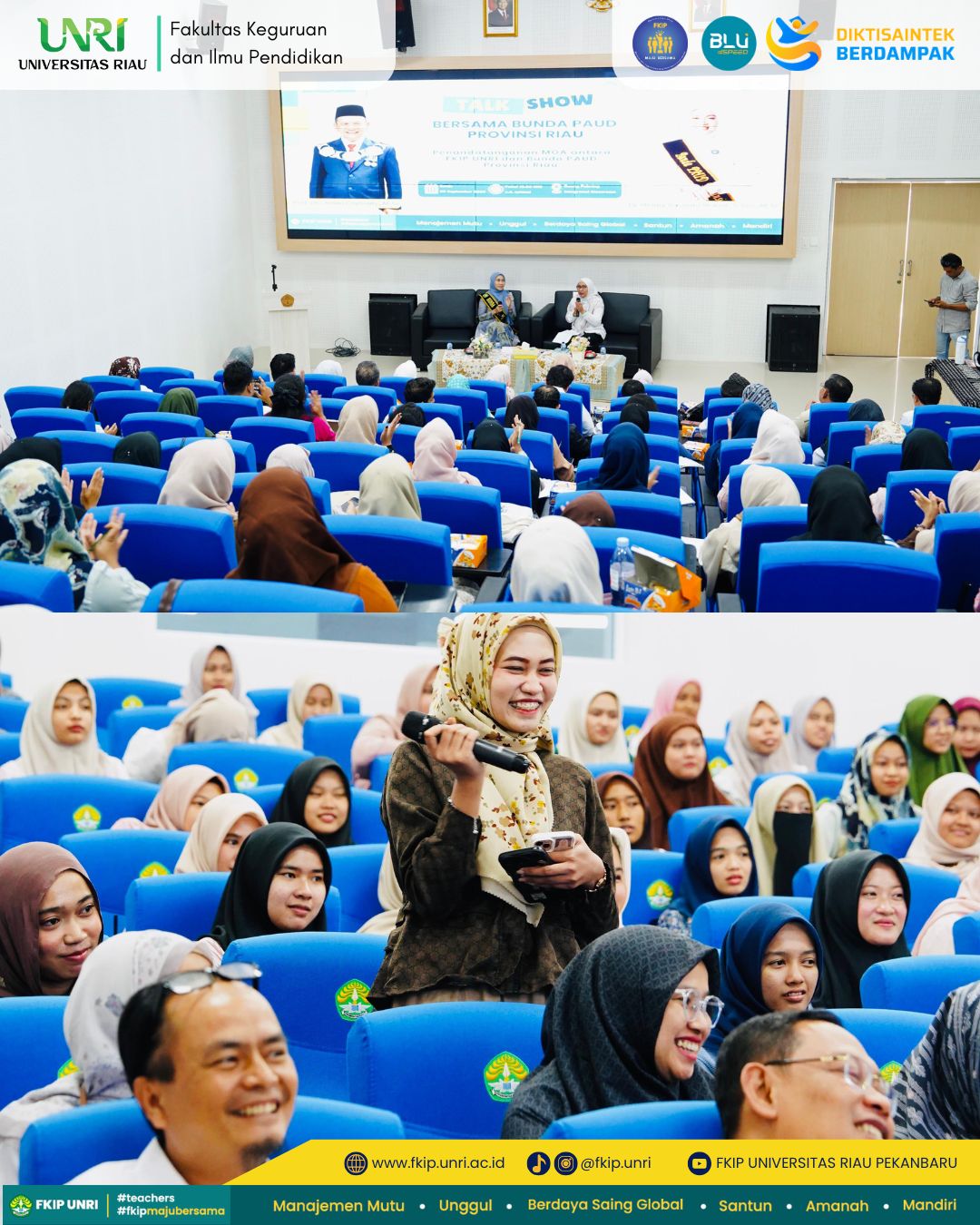 HUMASFKIPUNRI INFO - Pekanbaru, 8 September 2025, Fakultas Keguruan dan Ilmu Pendidikan Universitas Riau (FKIP UNRI) menyelenggarakan Talkshow bersama Bunda PAUD Provinsi Riau Hj. Henny Sasmita Wahid, S.Sos., M.Si. sekaligus penandatanganan Memorandum of Agreement (MoA) antara FKIP UNRI dan Bunda PAUD Provinsi Riau. Kegiatan ini dilaksanakan di Ruang Pakning Integrated Classroom dengan suasana yang hangat dan penuh antusiasme.