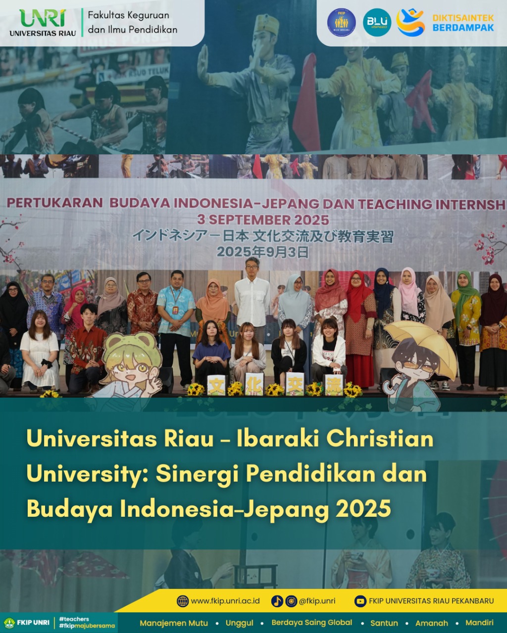 HUMASFKIPUNRI INFO - Program Studi Pendidikan Bahasa Jepang Fakultas Keguruan dan Ilmu Pendidikan (FKIP) Universitas Riau menyambut kedatangan dosen dan mahasiswa dari Ibaraki Christian University, Jepang pada Rabu, 3 September 2025 melalui program Pertukaran Budaya Indonesia–Jepang dan Teaching Internship 2025.