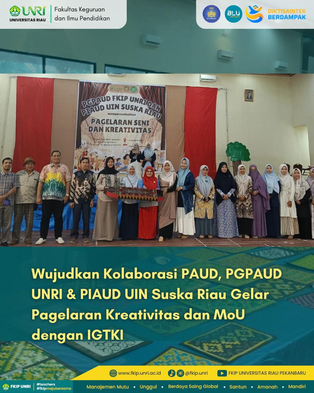HUMASFKIPINFO – Pekanbaru, 3 Desember 2025 — Program Studi PGPAUD FKIP Universitas Riau bekerja sama dengan Program Studi PIAUD UIN Suska Riau menyelenggarakan Pagelaran Seni dan Kreativitas yang dirangkaikan dengan penandatanganan kerja sama pada 3 Desember 2025 di Gedung M. Diah, FKIP Universitas Riau. Kegiatan ini merupakan bagian dari proyek UAS mahasiswa yang menampilkan hasil pembelajaran terkait pengembangan kreativitas dan seni untuk pendidikan anak usia dini.